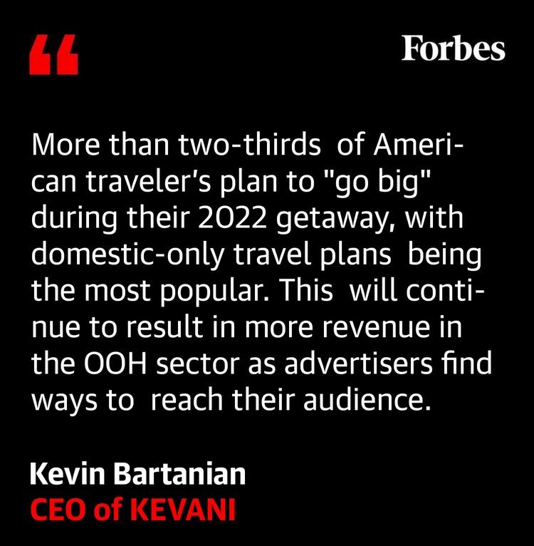 “Advertisers will invest in one-of-a-kind, unique assets that will gain momentum in major U.S. cities. With newly formed OOH 3D digital content companies around the world and the availability of full-motion displays in city centers, the “arresting” sensation will continue in 2022 and we will push the envelope on our platforms. More than two-thirds of American traveler’s plan to "go big" during their 2022 getaway, with domestic-only travel plans being the most popular. This will continue to result in more revenue in the OOH sector as advertisers find ways to reach their audience. The pandemic brought first-time advertisers to our platforms, 2022 will be no different. As we continue to increase our industry's market share, new categories like fintech, NFTs, crypto (with their supporting companies), and online sports betting categories will continue to flourish.”