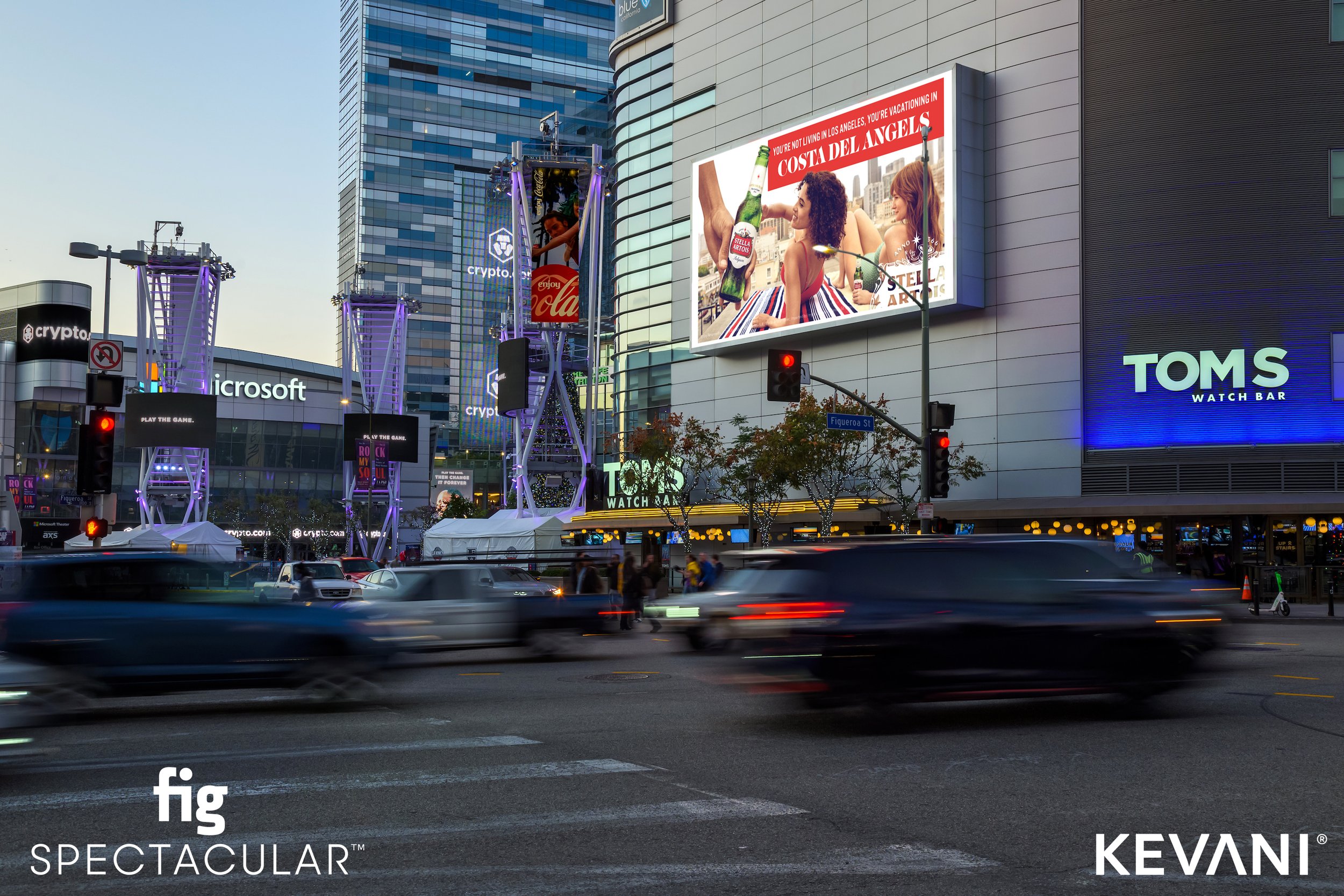The billboard, called Fig Spectacular, is surrounded by destinations including LA Live and the Microsoft Theater, as well as upscale restaurants, hotels and residences. The highly visible display sits directly across from the entrance of the Crypto.com arena.